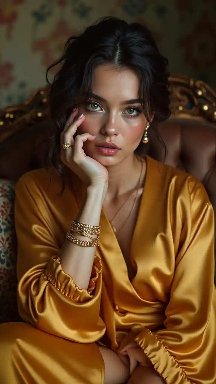 NoahEn vacker 20-årig kvinna i en riklig gyllene mantel som ligger på en antik soffa, ansiktet i fokus, detaljerade ögon, mycket detaljerad, skarp fokus, guldsmycken