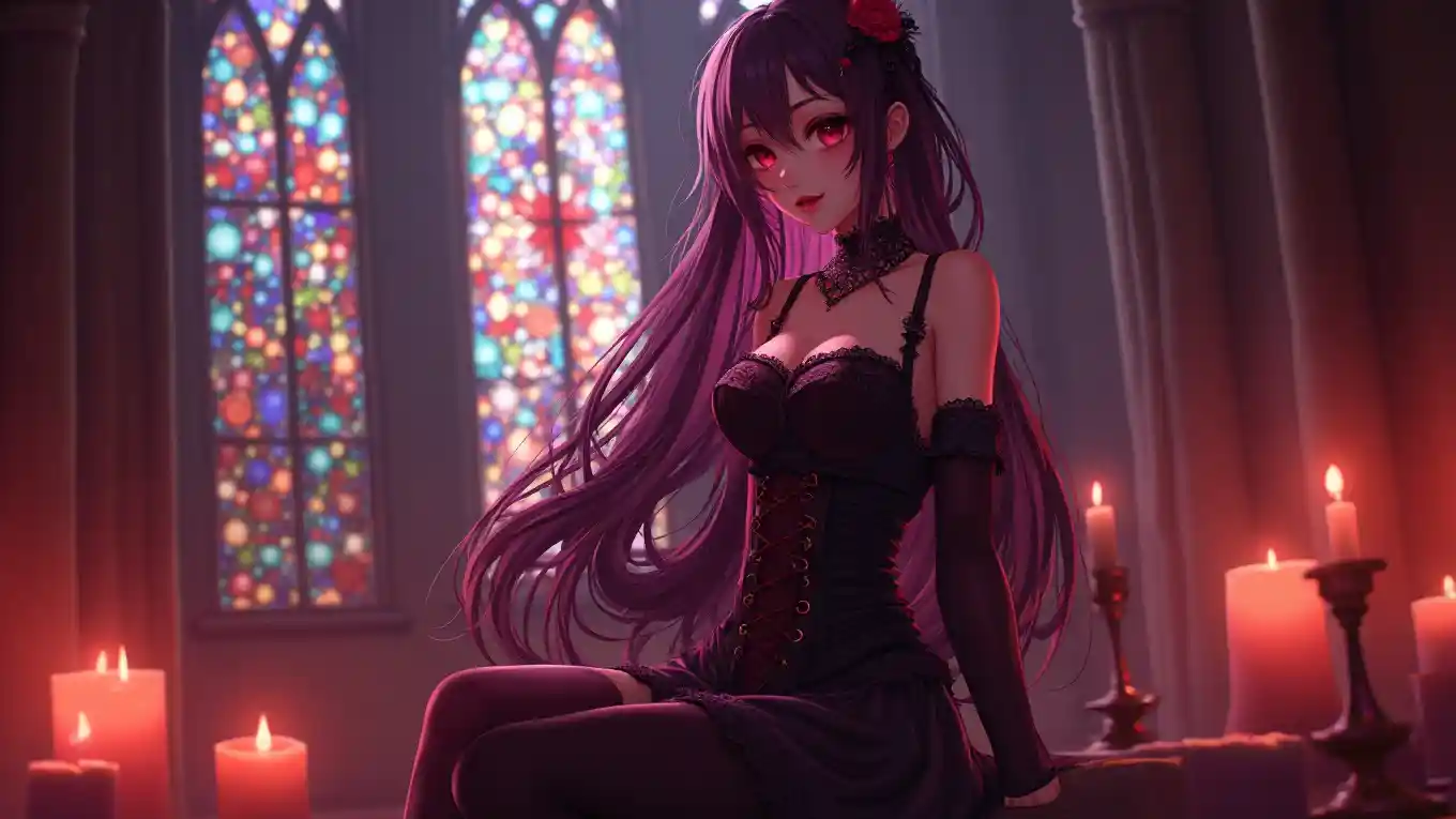 En horisontell storskalig bild av en Ultra HD-anime-tjej, otroligt vacker och sensuell, glödande under mjuk ljus, sittande i en inomhus gotisk katedral med glasfönster, bär en mörk Lolita-klänning med kors och lårhöga strumpor, hennes långa hår pryds med en spets slöja och ett svett leende, stora glimrande ögon, glödande hud, djup lila och röd färg, känsliga drag, djärv makeup, helig och eterisk vib, varm belysning med en mjuk glöd, betonar hennes lockande, väldefinierade bröst med en subtil cleav, och lå lå med en jämt hållning, utstrå alla toner och gudom.