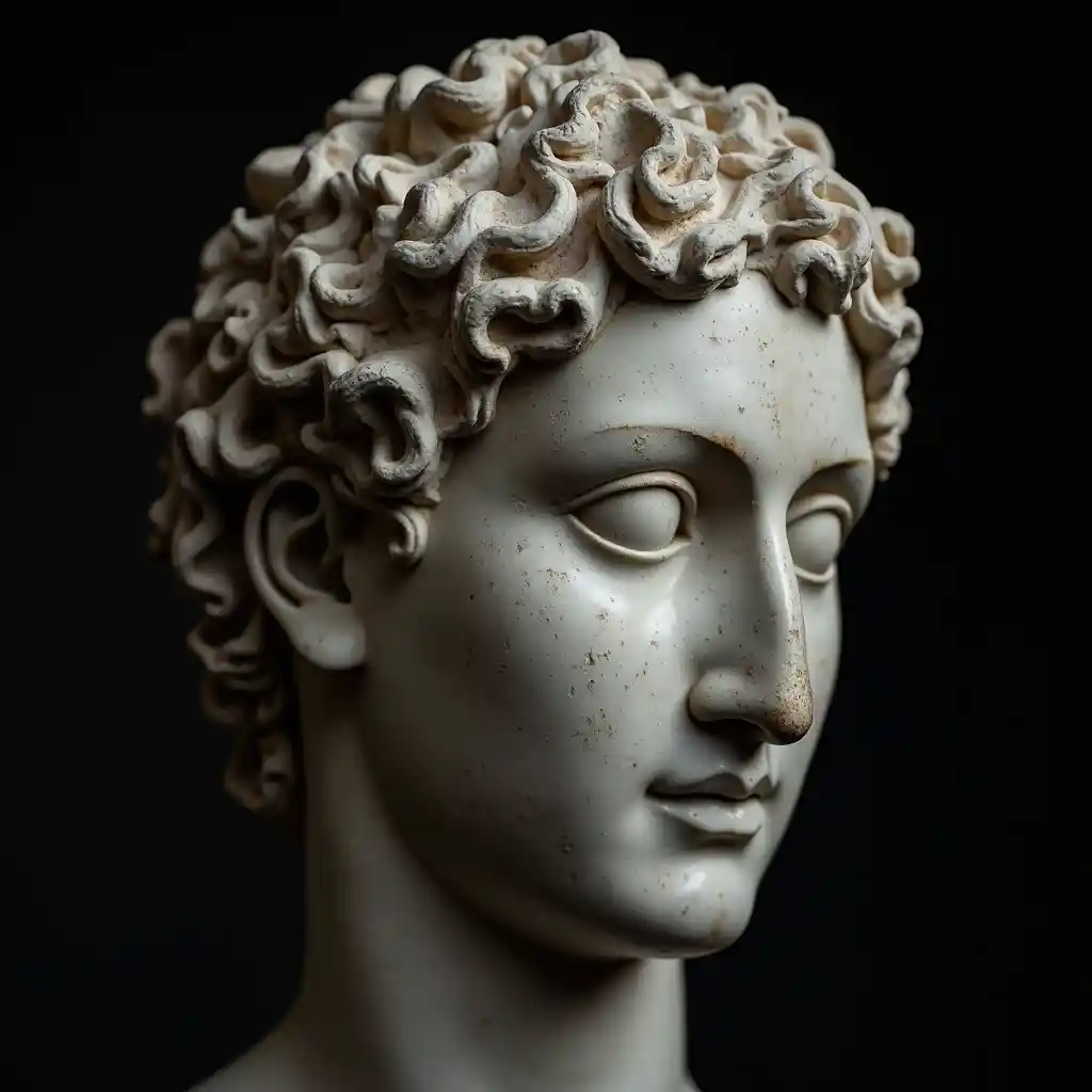 MackenzieHalva huvudet på en antik grekisk marmorstaty, skarp i detaljer, mörk atmosfär