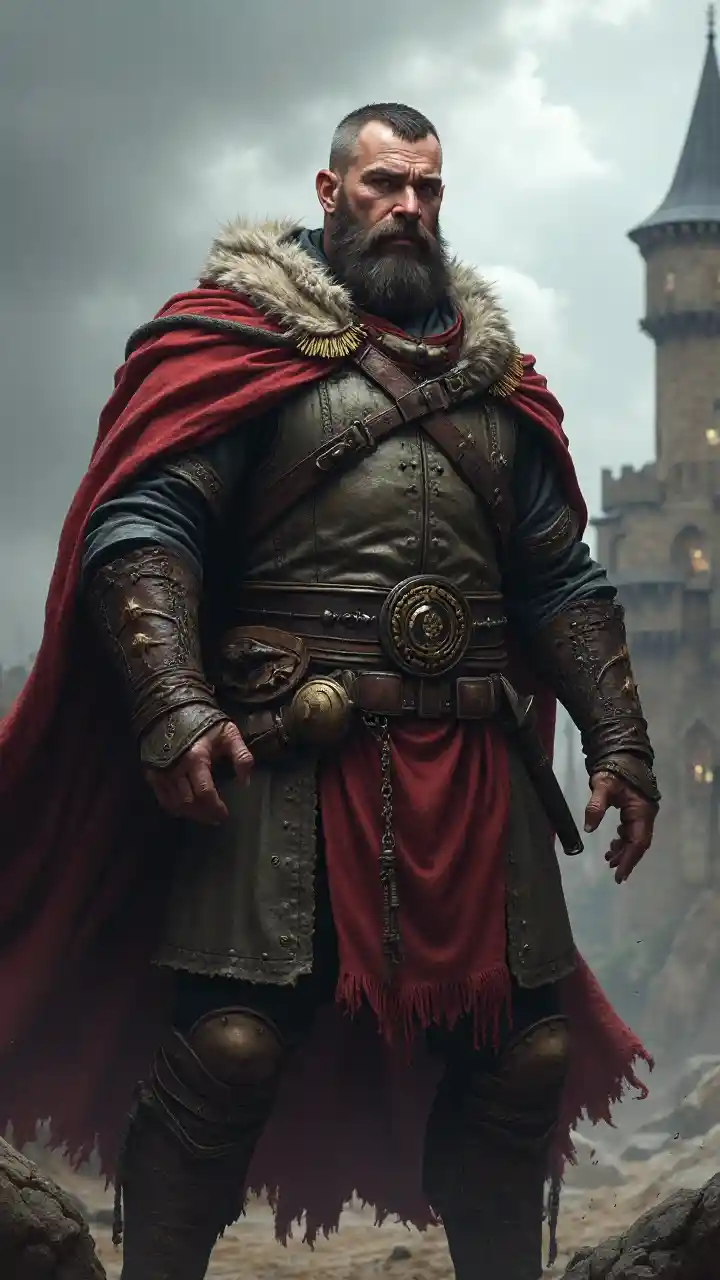 Mannen, 39 år, muskulös, ädel, stor trollkarl med kort hår och skägg, i ett vindigt slott, vägvisare, d & d inställning, förbättrad skuggkvalitet