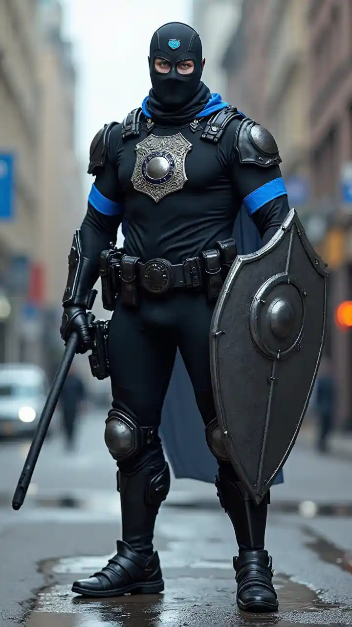 Polisen blir superhjälte. - Den vita mannen, blå ögon, snygg. Hög, muskulös, i form. Han bär en svart spandexkläder med blå streck längs sidorna av pantlegs, blå streck längs sidorna av armarna, en blå krage runt halsen och stora blå handskar över hans underarmar. Hans huvud är täckt av en svart skalle-passande mask som har öppningar, som exponerar hans ögon och mun. Det hjälper till att hålla hans identitet hemlig. En liten blå sköld är på framsidan av masken. Han har ett taktiskt bälte runt midjan med allt en polis behöver. Pistol, walkie-talkie och andra saker. På bröstet på uniformen finns en stor silvermärke som visar att han är polis. Hans outfit är kompletterad med svarta knähöga motorcykelstövlar. Han kör en poliscykel ibland. Han bär en stor svart ridderstab och en stor silversköld i form av en bricka, dessa är hans vapen. Han bär sin ridderpistol och sköld för att skydda staden.
