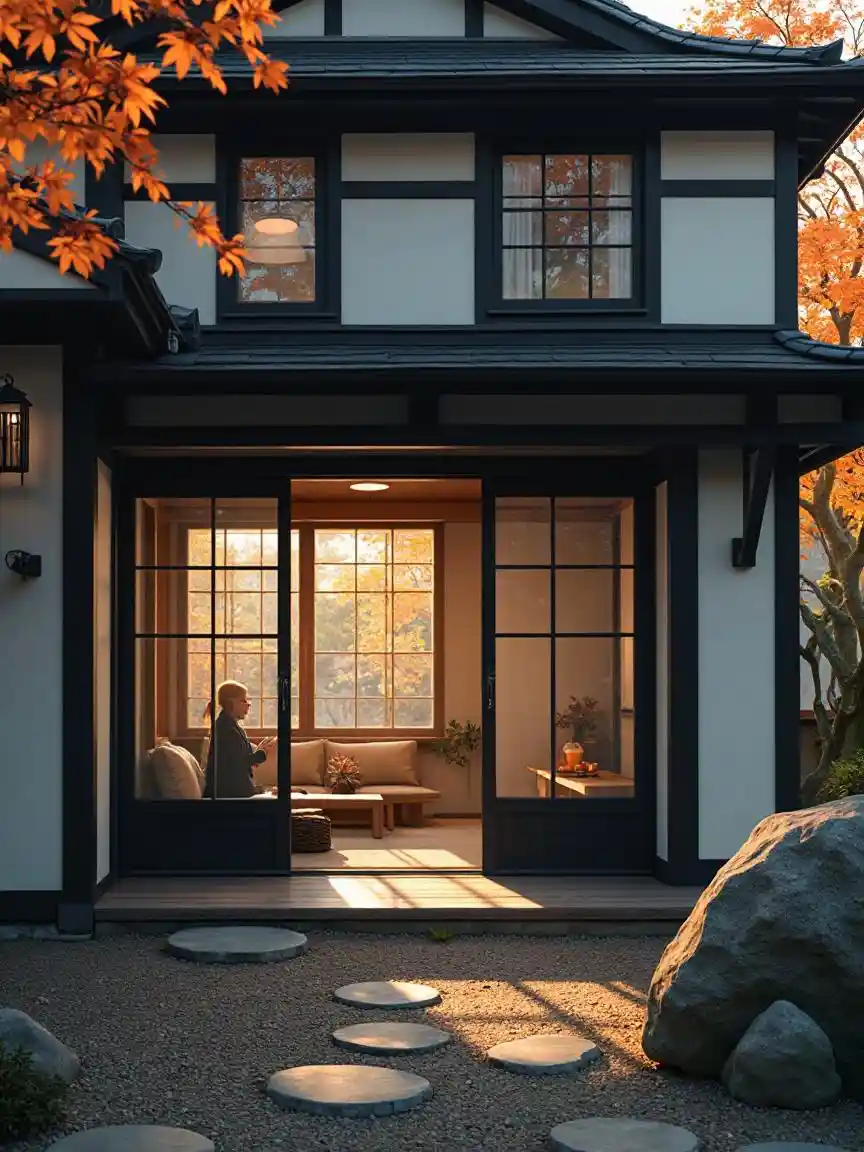 Ett hus i japansk stil med stora fönster och trämöbler, med traditionell arkitektur och en sten framför fönstret. Byggnaden är gjord av svart trä och vita väggar, vilket skapar en atmosfär som påminner om det gamla Japan. En person i huset dricker te medan han sitter på en bänk utanför glasdörren. På hösten skiner solljuset genom fönstren på marken.