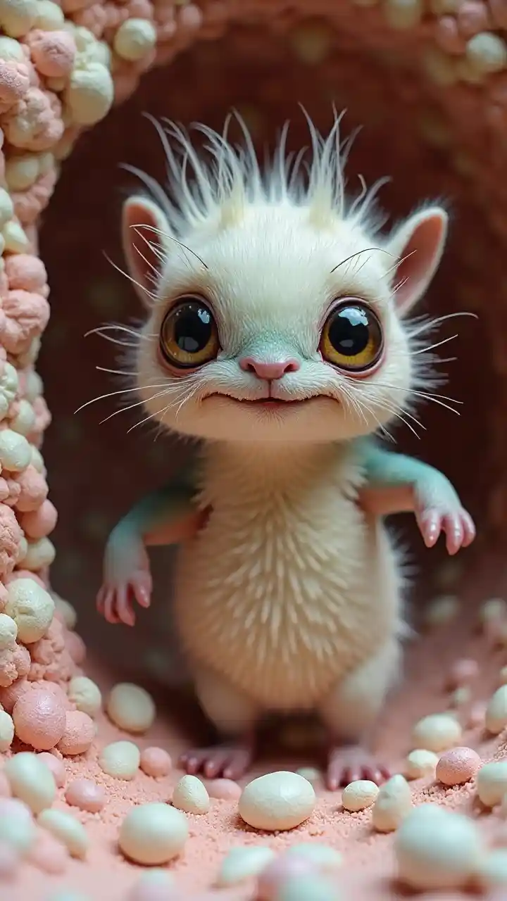 En närbild av en konstig men fascinerande varelse som människor skulle kalla jubbafenxer om de någonsin sett en, denna varelse lever i en grotta gjord av marshmallows och sockerbarer vilket inte är någon mening eftersom den är absolut allergisk mot socker, när den äter socker börjar den svullna och fissa på ett helt absurt sätt, på grund av detta lidande denna varelse har onormalt stora ögon men är helt söt, den har en blandning av fjäder och i alla färger som är kända för mänskligheten