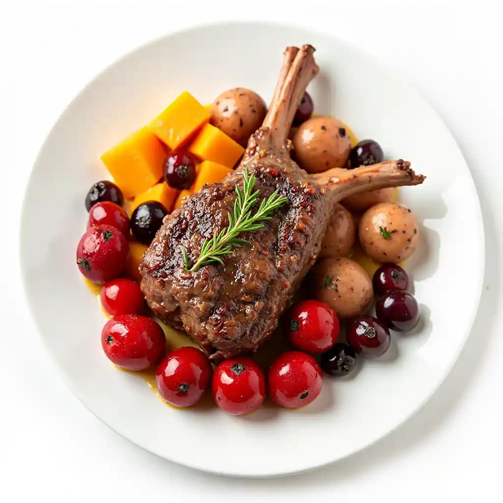 Jaydenlammkött, bär och sötpotatis, vit bakgrund