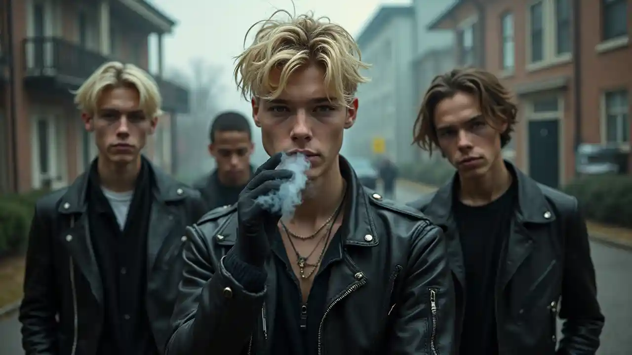 Blond, homosexuell, 16-årig elev i läderkläder, rökning på skolgården, med vänner, alla med läder, läderhandskar, hög kvalitet, realistisk, urban, spännande, humörlös belysning, detaljerad ansiktsdrag, läderkläder, lädertröjor, cool toner, atmosfär, upprorisk, detaljerad omgivning, vänner i läder, skolgårds miljö, rökning, intensiv blick