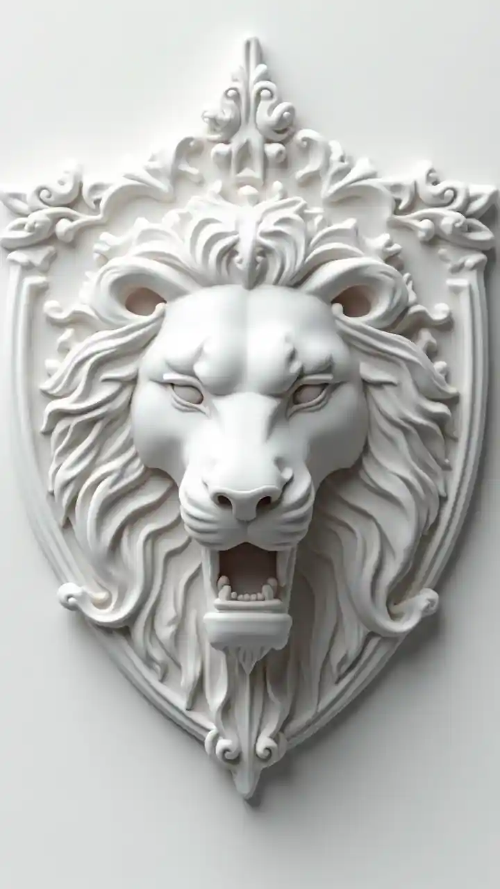 Ljusansikt i basrelief på ett sköldformat hängsel.3d, hög upplösning. Vit marmor. Endast en färg