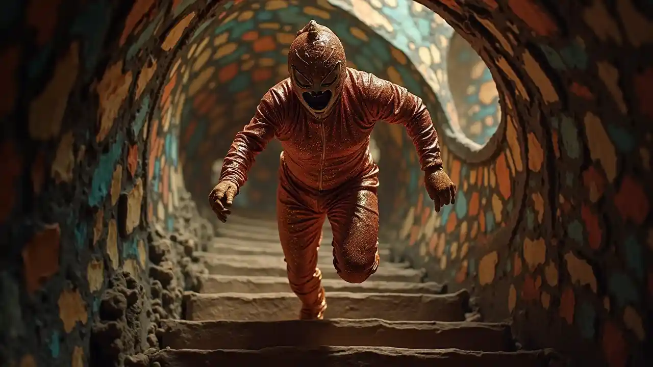 en maskerad luchador (i en fullständig gnistrande luchador kostym) som springer ner en oändlig spiral trappa