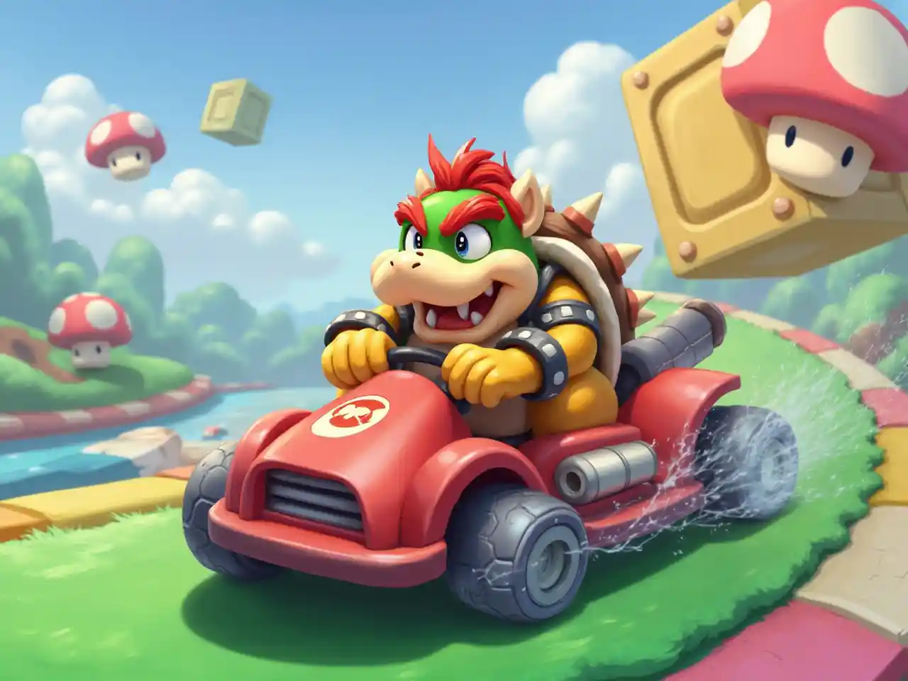 Bowser kör en röd Mario Kart på en färgstark bana, med Super Mario-objekt som svampar och ett block som flyter i bakgrunden.