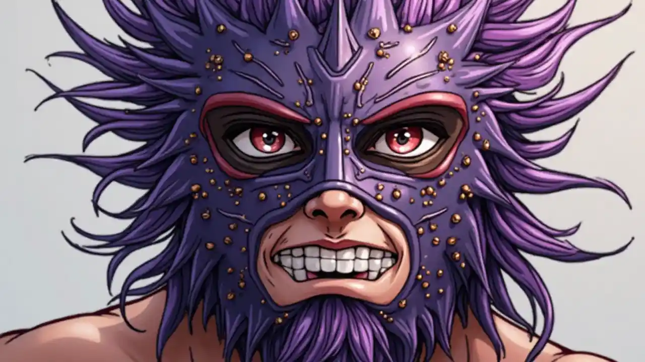 Närbild av en person som bär en spikad brottningsmask med lila hår.