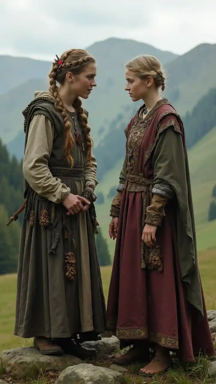 En hel längd av en 14-årig flicka från kungariket Powys i medeltiden Wales 1050AD prata med en gammal man på en bergssida. Hon har håret gjort i medeltida walesiska stil. Hon bär medeltida walesiska kläder. Hon har på sig medeltida walisiska ansikts- och kroppssmycken och smink.