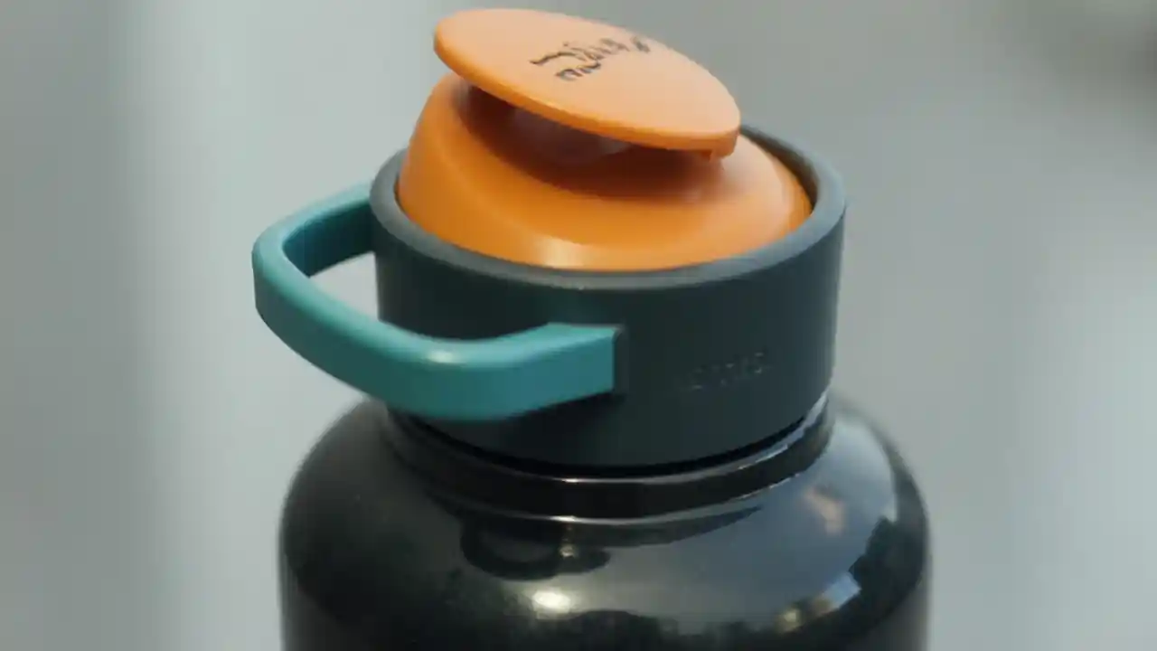 Närbilder av en mörk metallflaska med ett blått och oranskt plastlocket.