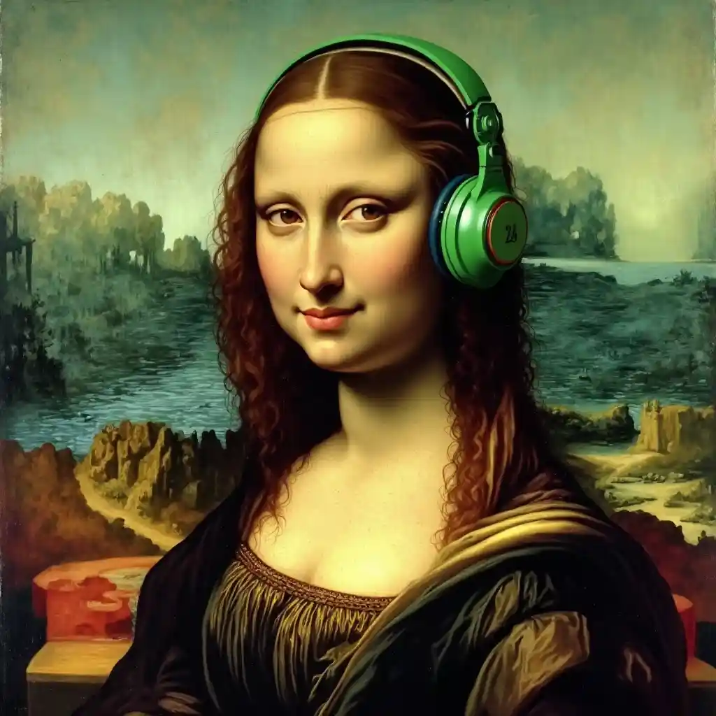 CamilaPorträtt av Mona Lisa i en mycket djup hals av renaissanceens ljusa gröna hörlurar, kvinnan i mitten av ramen, mot bakgrund av havet och fyr