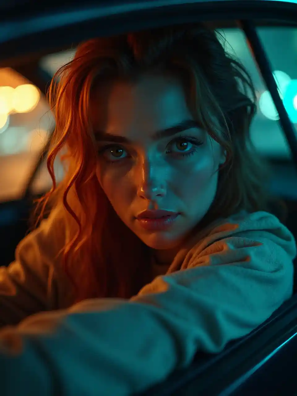 Filmisk närbild av en mystisk kvinna med brunrött hår som sitter i en bil på natten, mjuk neonbelysning reflekterad på glaset, intensivt uttryck, humörigt futuristiskt glöd, varma orange och teal färgtoner, reflektioner och ljusstreck över fönstret, skarp fokus på ögonen, mjuk bakgrund bokeh, låg nyckel belysning, urban noir atmosfär, ultra realistisk porträttfotografi stil, dramatisk belysning kontrast, mjuka skuggor på huden, elegant men intensiv visuell berättelse, mästerverksklarhet, 8K ultra skär upplösning, prisbelönt fotestetik, DSLR-lens kvalitet