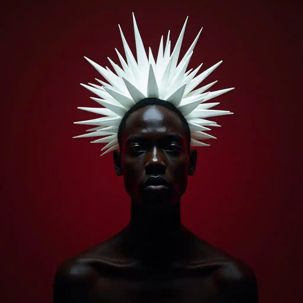 Ett surrealistiskt och modernt porträtt av en mörkhyad person med en abstrakt, glödande vit krona gjord av skarpa geometriska spikar som en stjärn. Figurens ansikte är upplyst i rika skuggor, vilket skapar en stark kontrast till den glänsande kronan. Bakgrunden är en djup, blodröd nyans, som förstärker den dramatiska atmosfären. Motivets uttryck är intensivt och gåtfullt, som utstrålar kraft och mysterium. Belysningen är stiliserad för att ge en futuristisk och andra världs effekt.