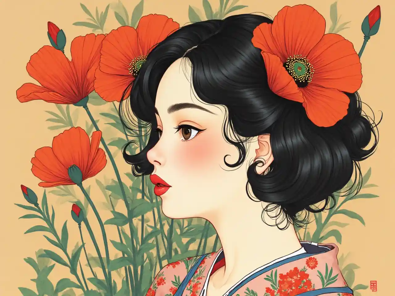 Hiroshi Nagai, ultrafin detaljerad målning av en kvinna med en opiummök i håret, fin och detaljerad målning