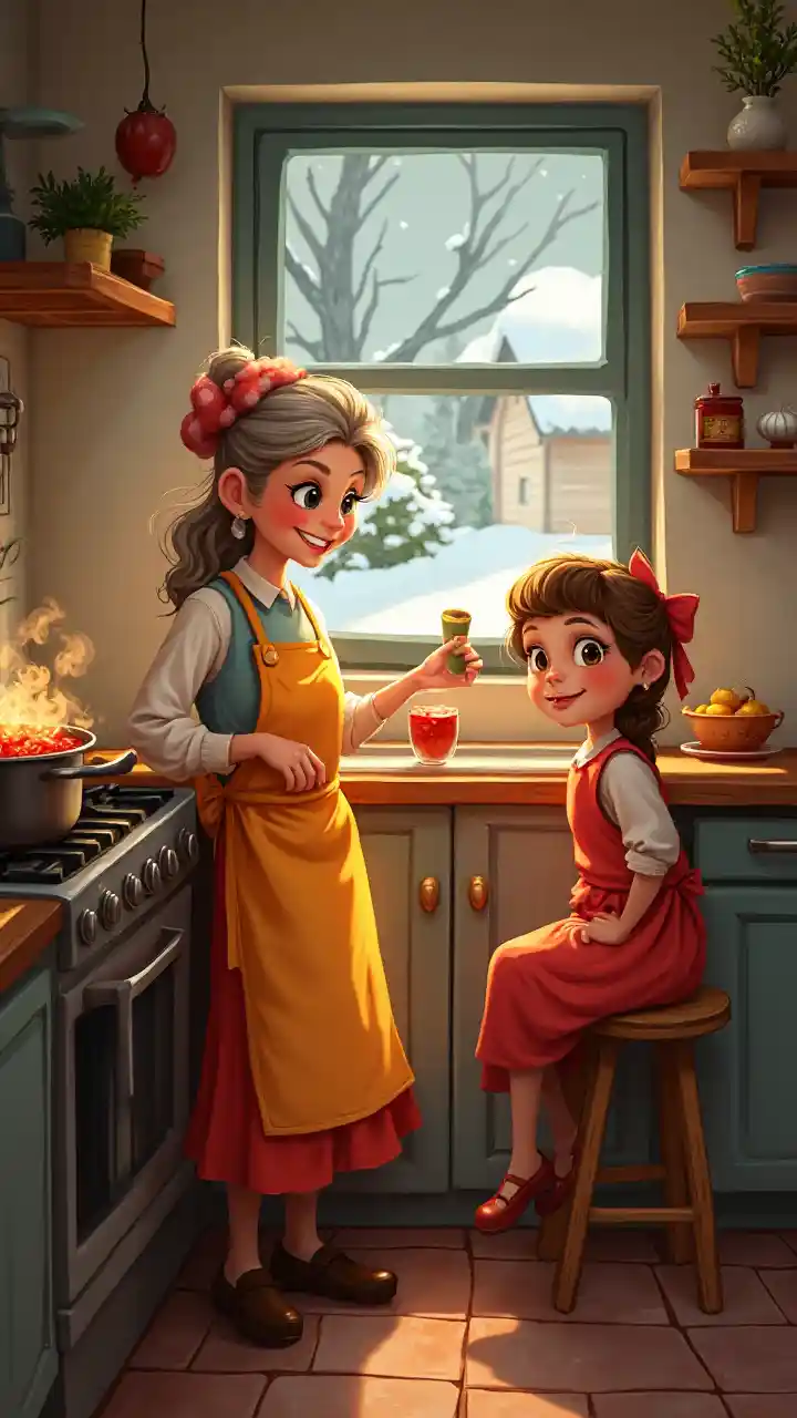 Ett varmt kök med en glad Nonna Rosa, som bär en ljus förklädnad, som rör en stor kruka tomatsås på spisen. Sofia sitter bredvid på en stol med stora, nyfikna ögon. Ett fönster visar den snöade byn utanför, och kökshyllorna är fulla av kryddor och vitlök.