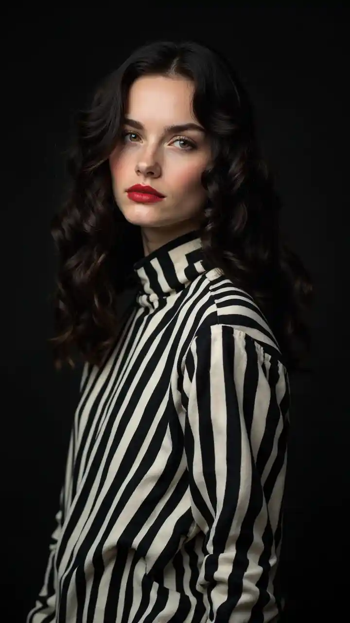 JaydenEn ljusmodell, med svartvit randiga klänning med hög krage, kontrastbelysning, ljusröd smink, svartvit lockigt hår, mörk bakgrund, modell, tidningsomslag, professionell bild,