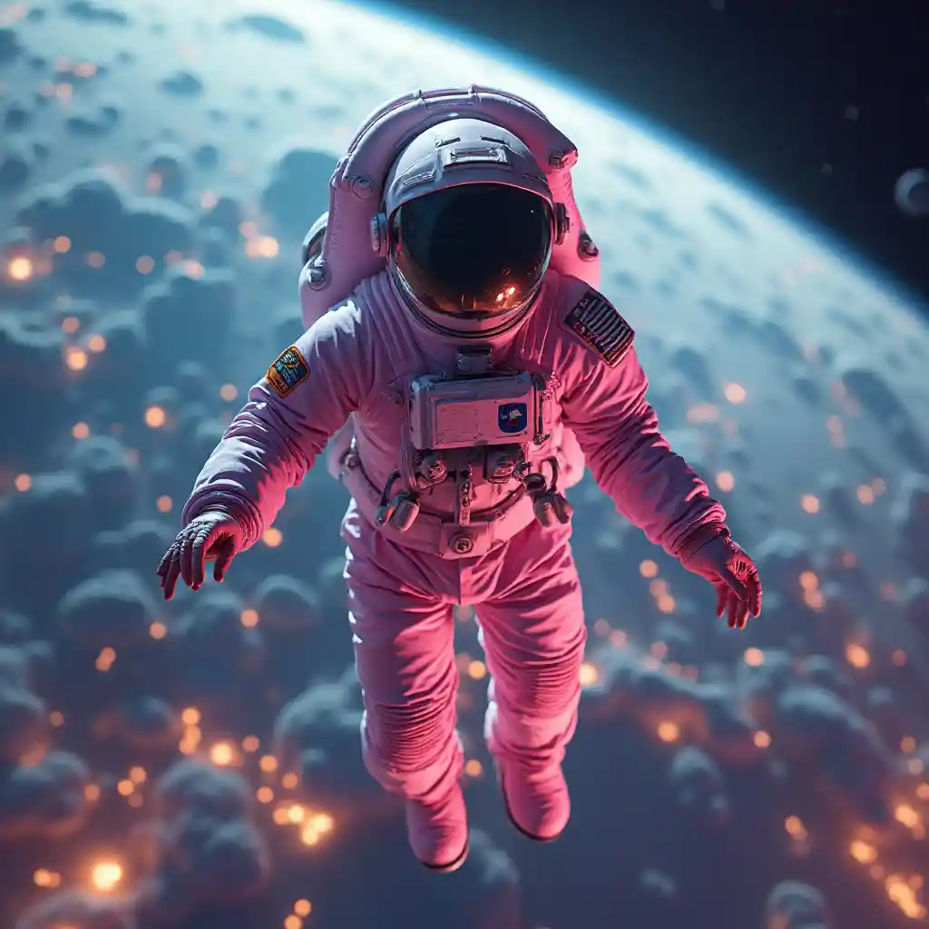 En filippinsk person som ska i rymden, klädd i rosa astronautdräkt, livliga mättade färger, kontrastljus, studiobild, professionellt foto, detaljerad bild, flyter på utsidan av ett rymdskepp med jorden i bakgrunden.