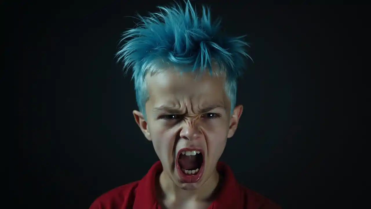 Spoiled brat teenager punk rebel frowning attitude, blue punk hair, angry face, front on symmetrical photo realistic black background