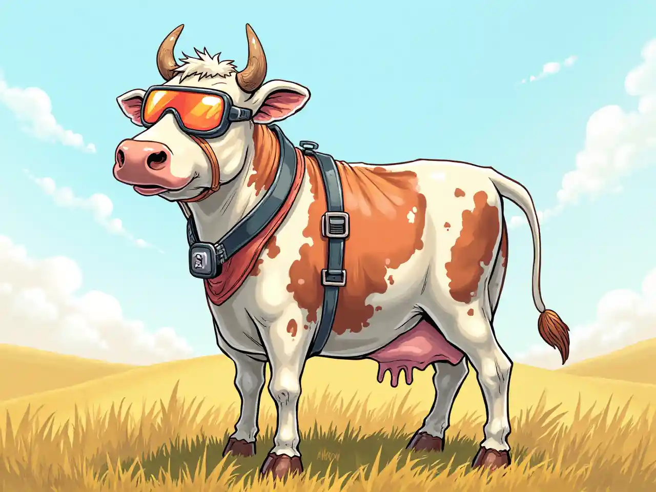 KinsleyTeckna en ko som står upprätt på ett gårdsfält. Koen har en racinguniform och koen har racingglasögon.