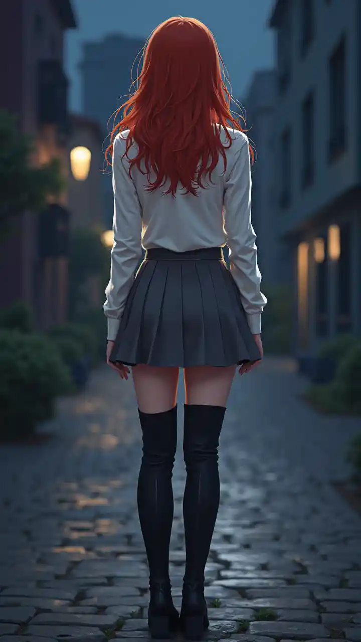 BenjaminRödhårig skolflicka, vit blus, grå kjol, svarta lårstövlar, nattlandskap, full längd bild
