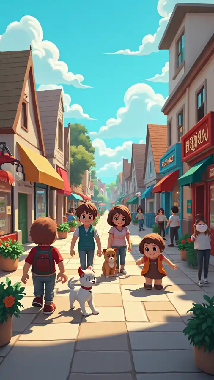 Tecknad torg med Roblox-figurer och husdjur. Folk går med hundar och en barnvagn nära butik.