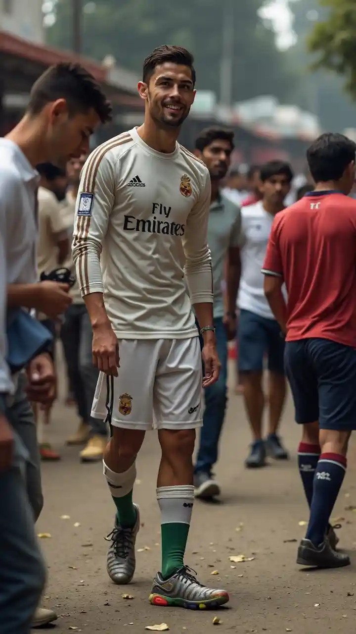 Cristiano Ronaldo ska köpa skor och Messi tigger där, många människor roar runt i Indien