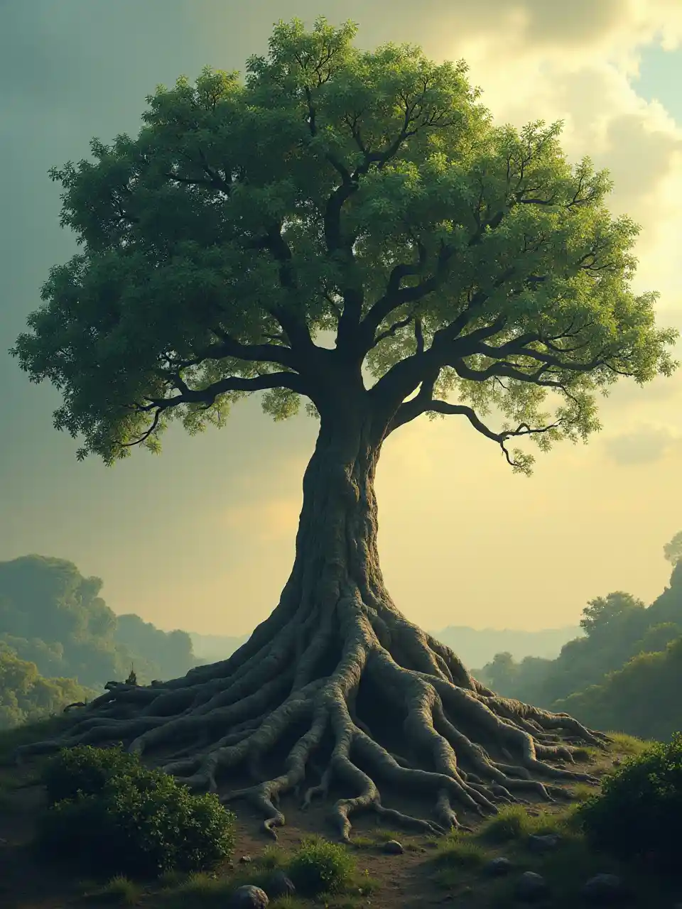 JonathanBilden av ett majestätiskt träd med djupa rötter och vidsträckta grenar som symboliserar sammanhållning och engagemang i en naturlig miljö som framkallar en känsla av djup och lugn