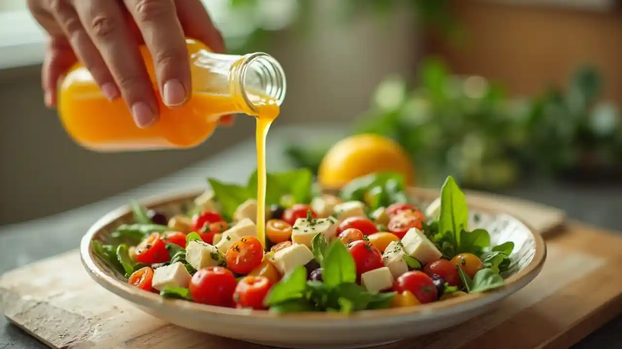 BellaSalat Dressing blandas med lite apelsinsirap häll över grekiska sallad, hålla flaskan som sallad dressing häll i proportion