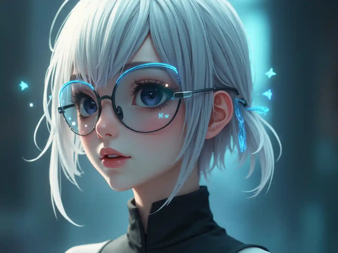 EllaEn liten tjej med smarta asiatiska drag, silver hår och futuristiska glasögon