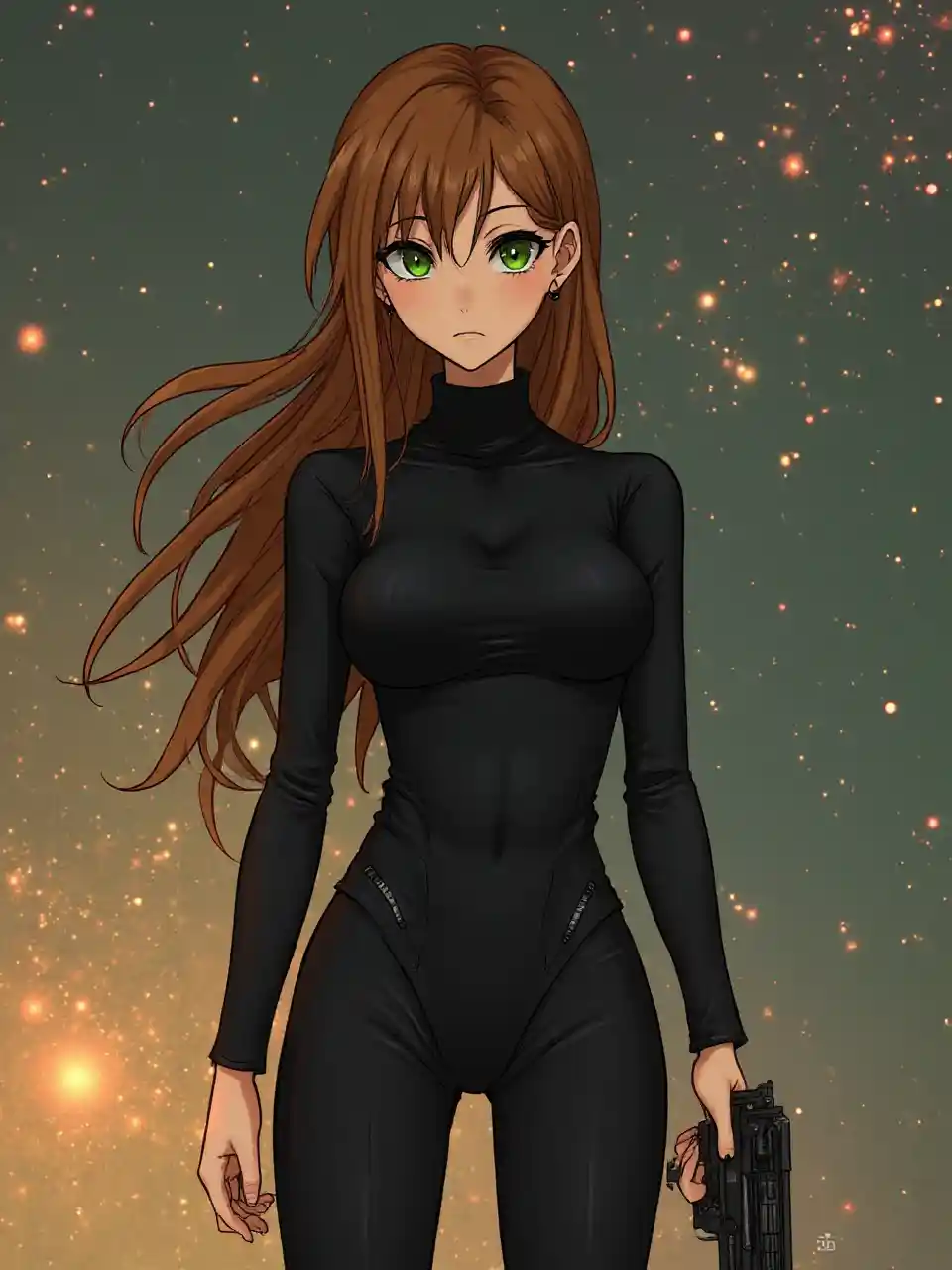 OliviaSlank svart kläder brun tjej vackert grönt ögon brunt hår maskingevär galaxen