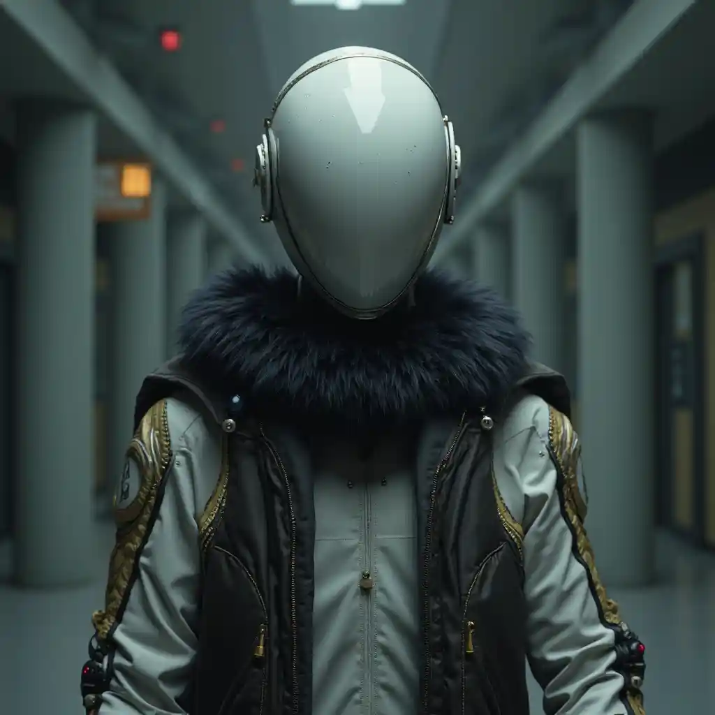 minimalistisk modig dyster porträtt av rymdrobot, pälddetaljer, minimalistisk design, minimalt, Versace, givenchy, film fortfarande från Wes Anderson, fotografi, fotoreal, 200mm, HD, f/2.0, mycket detaljerad, exakt