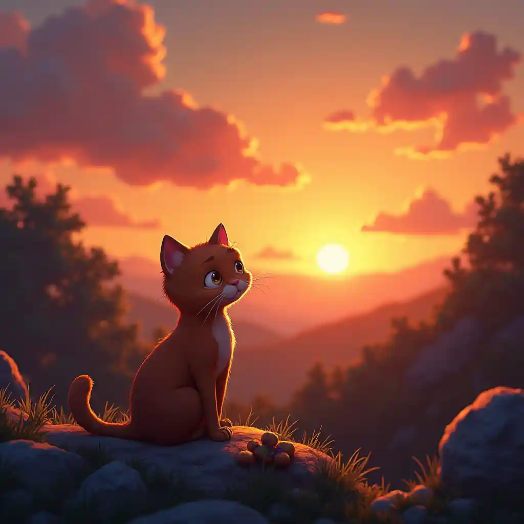 En animerad katt som njuter av solnedgångens skönhet
