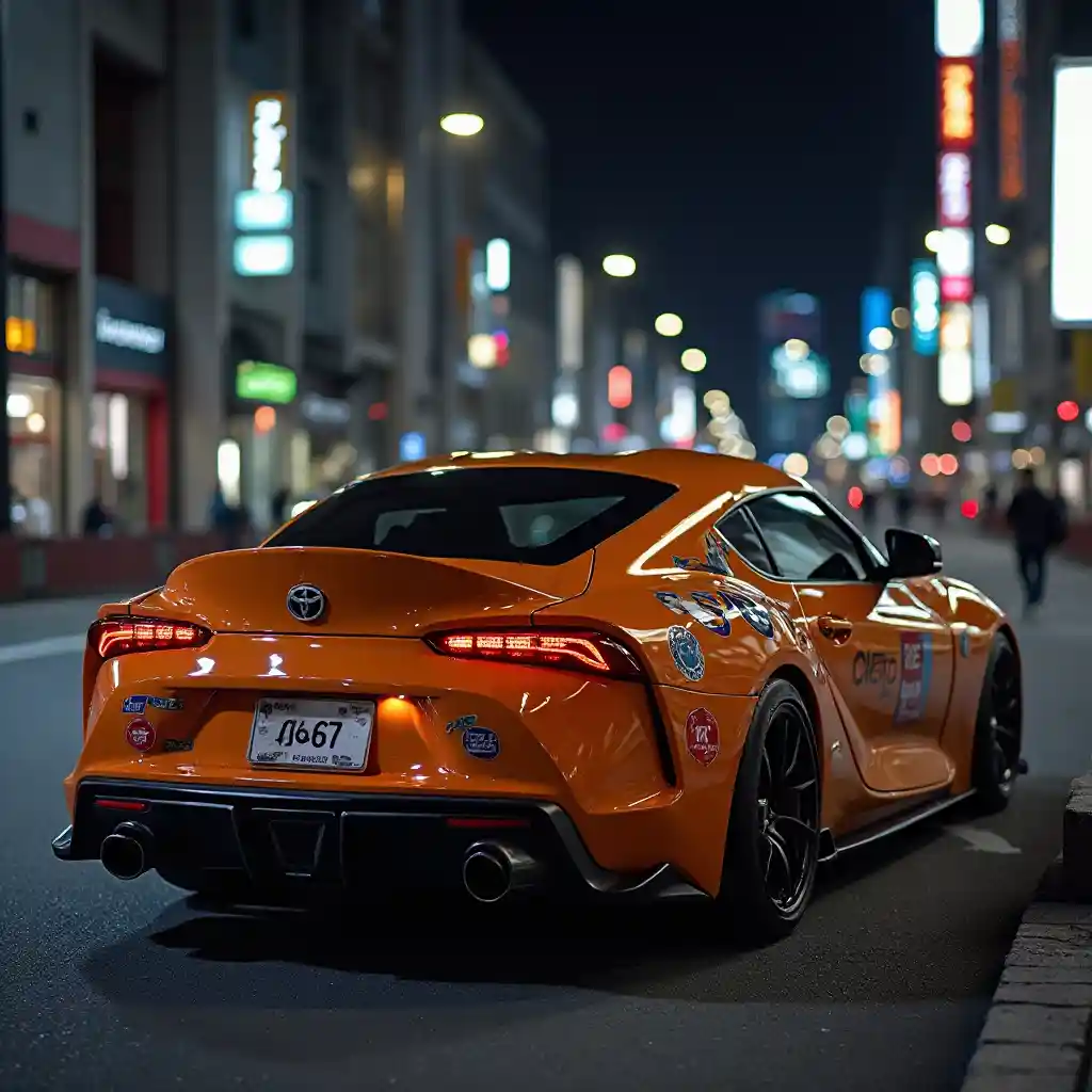 Jag vill ha en Toyota Supra 2jz 3.0 modell. Låt det vara orange, bakgrunden ska vara natt och Tokyo. Låt Supra ha Paul Walker-märken på sig. Låt registreringsnumret vara 67