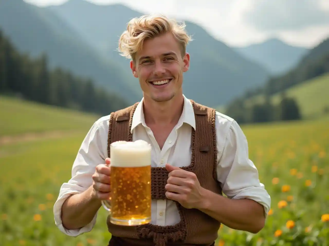 CamilaUng blond tysk 20-årig man klädd i en traditionell tysk kostym med ett leende på ansiktet håller en stor ölsk och smör på paradissfält