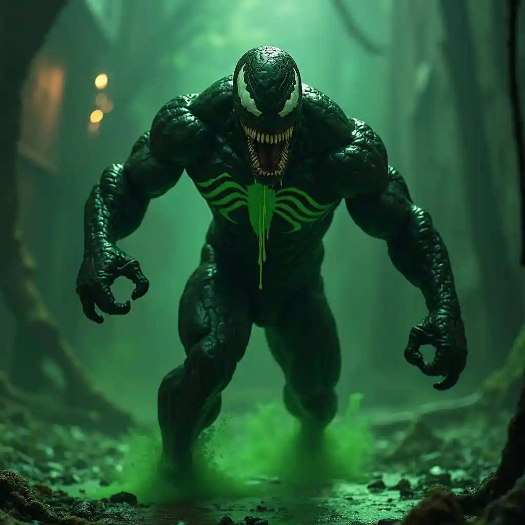 Grönt Venom droppar syra, fotorealistiskt, 8k upplösning, hjälte, hantering, mörker, skräckscen