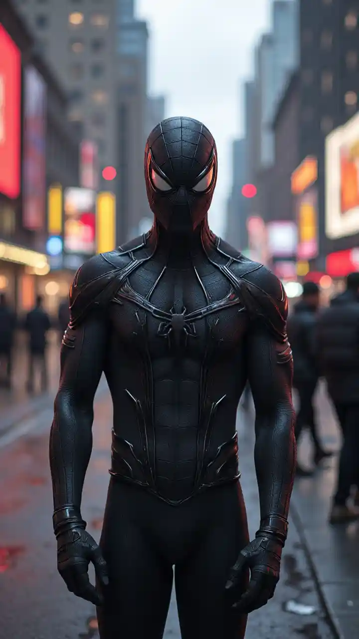 Venom-dräkten Spider-Man står redo på en livlig New Yorks gata, fångad i ultra hög upplösning med invecklade detaljer och hög kontrast, med hjälp av fysik baserad rendering för fotorealism. Detta professionella 8k HD färgfoto, som påminner om ett skott som tagits med en Nikon D850 och en Cinestill 800 film, visar den ikoniska karaktären i sin eleganta, texturerade svarta kostym. Reflektioner från stadens ljus dansar på hans kostym, förstärkt av avancerade strålsporningstekniker. Den dynamiska energin i gatuscenen ger djup och livskraft, medan subtila kreativa förändringar säkerställer att bilden är både fängslande och sann till essensen av en filmupplevelse.