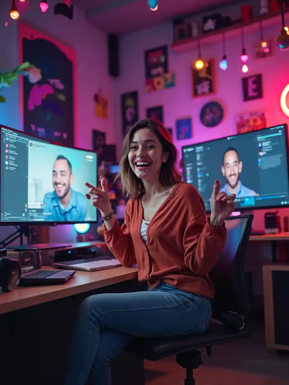 En livlig Youtuber, en energisk atmosfär, glada uttryck, en modern studio med färgglad belysning, elegant digital utrustning, en stor skärm som visar live-chatt, avslappnad och trenderad. Bakgrunden har lekfulla dekorationer, dynamiska kammarvinklar, en del spelminne, ultra detaljerad, fotorealistisk med stort djup och klarhet, som fångar essensen av en livlig innehållsskapande miljö. "Märkaren".