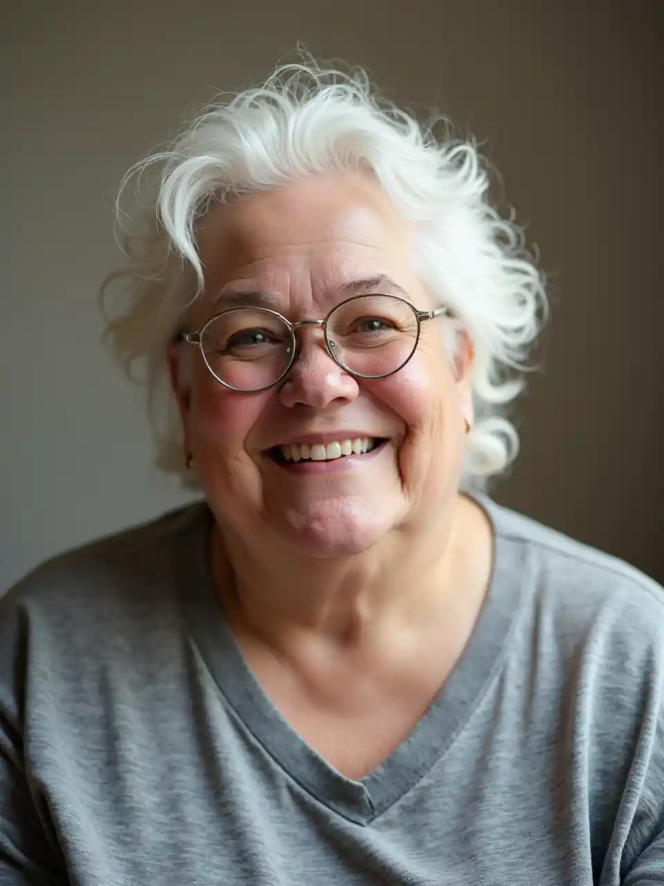 OliviaOne fat smiling mom white hair wearing round shape glasses
