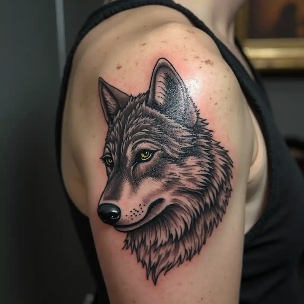WilliamMedelstor varg tatuering i konstnärligt svart bläck på höger axelblad