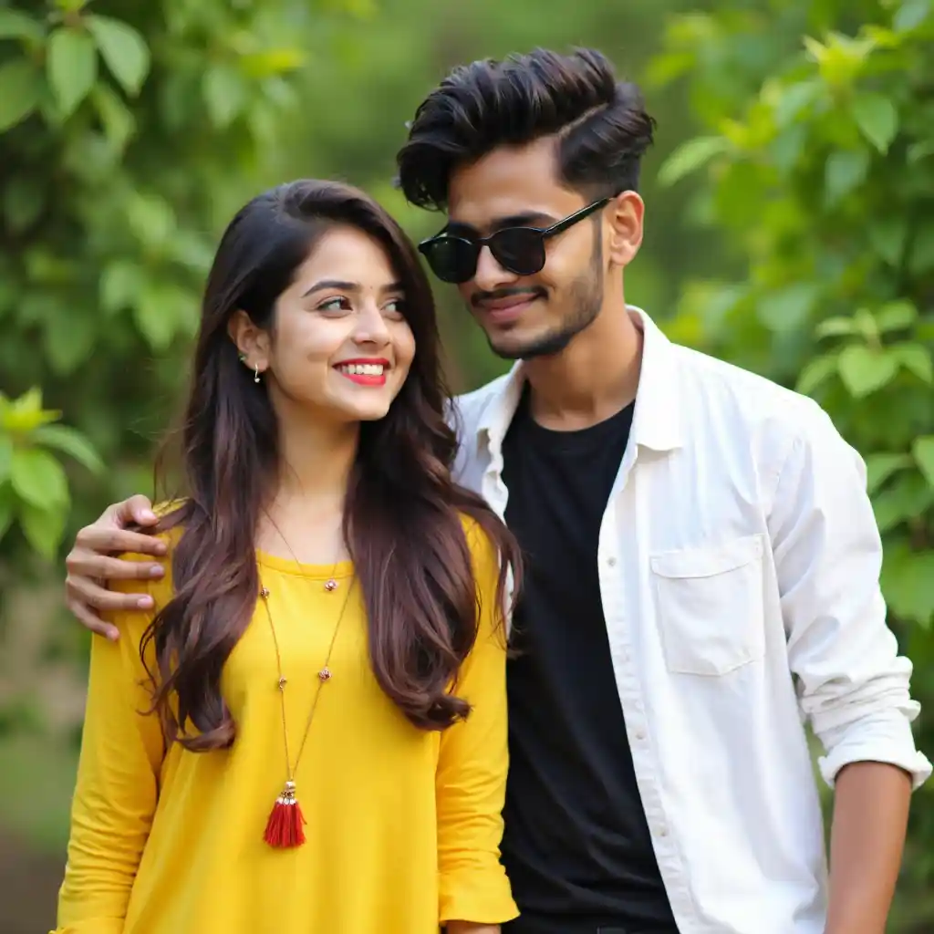 Mot en mjukt suddig bakgrund av frodig grönska poserar ett ungt par nära, och det utstrålar en känsla av värme och förbindelse. Kvinnan, klädd i en levande gul kurta med ett enkelt rött halsband, visar elegans med sitt långa hår som faller ner, medan hennes milda leende utstrålar självförtroende och charm. Bredvid henne bär mannen en snygg vit skjorta över en svart T-shirt, kompletterad med trendiga solglasögon som ger en sval kille till sitt utseende. Belysningen är ljus och visar på en solig dag, vilket förstärker livskraften i deras färger och uttryck. Kompositionen återspeglar inte bara deras kläder utan också den livliga atmosfären av ungdom och sällskap.