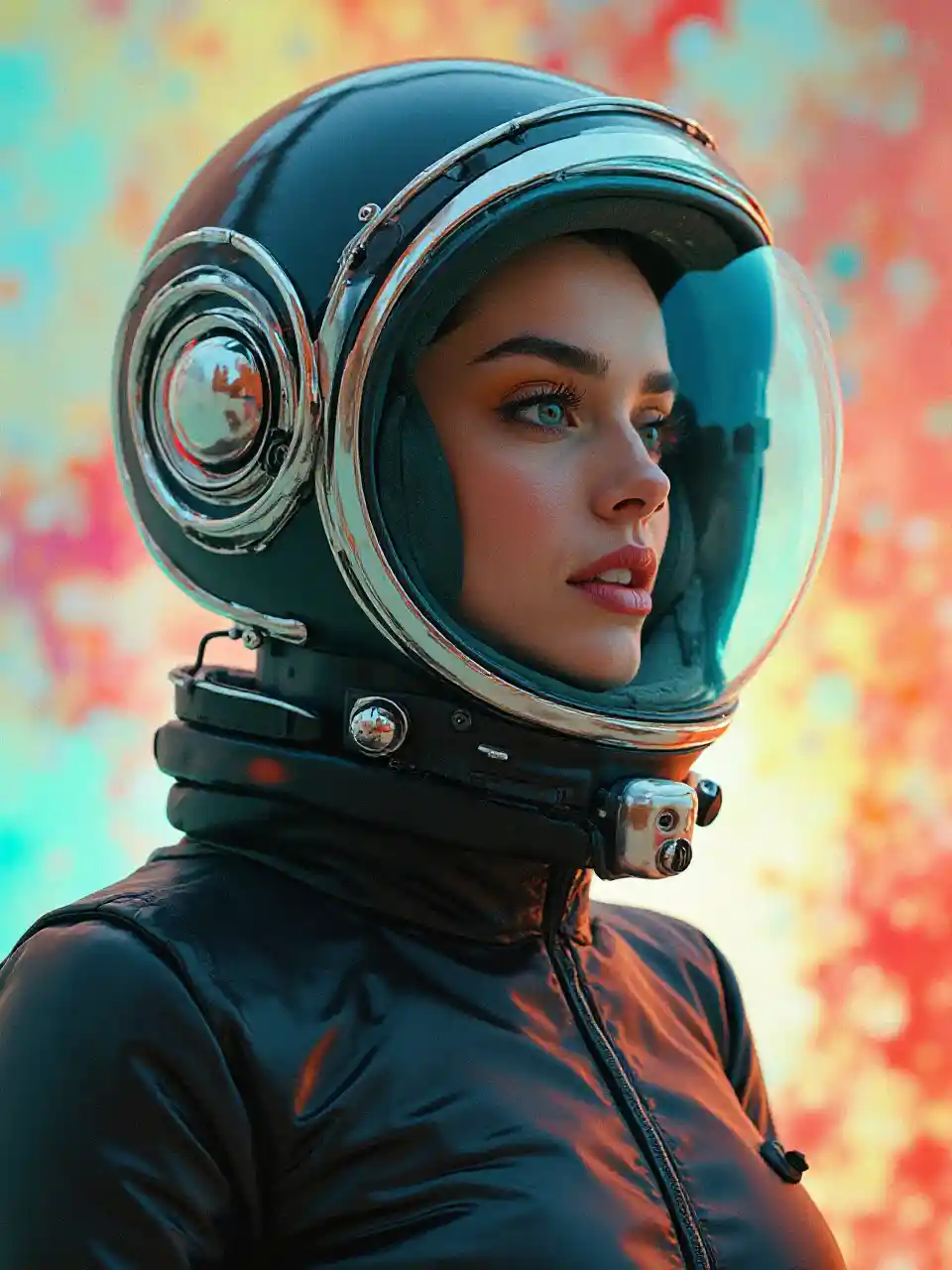 Abstract 1998, Fashion picha, 24mm, mbali risasi, 60'S astronaut mwanamke katika nyeusi na fedha spacesuit na kubwa plexiglass kofia , 80 digrii mtazamo, sanaa na Victor Moscoso na Bridget Riley Kodak 100K, Kufanya ni ya kichawi na Carne Griffiths sanaa fluid, Conrad Roset ilya kuvshinov, Mark Fielding, zwy studio high lights in eyes, salt.