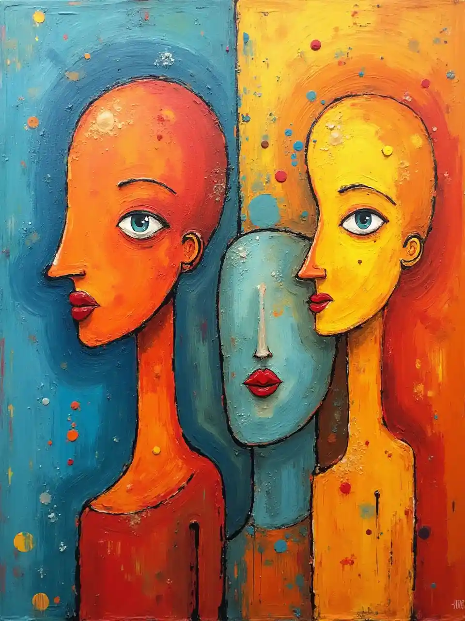 Mtindo wa Kandinsky. Abstract Expressionism uchoraji wa mafuta. Picha ya 2D ya vichwa vya totem vya wanaume na wanawake wenye kichwa cha oval, macho mafupi, pua na midomo mikubwa. Orange Red Bluu manjano ni rangi kubwa, background imegawanywa katika ukubwa mkubwa rangi pastel, textured viboko rangi matone na splashes intuitive, tofauti kati ya picha kuu na background, minimalist.
