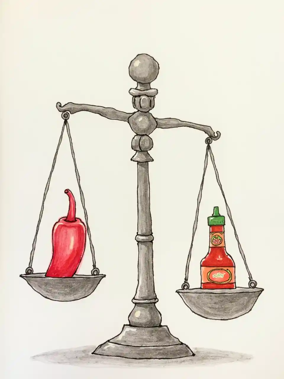 Chora picha ya mtu aliye kama mizani, na pilipili nyekundu upande mmoja na chupa ya mchuzi kwenye upande mwingine, ambapo upande wa pilipili nyekundu unaongoza mizani.