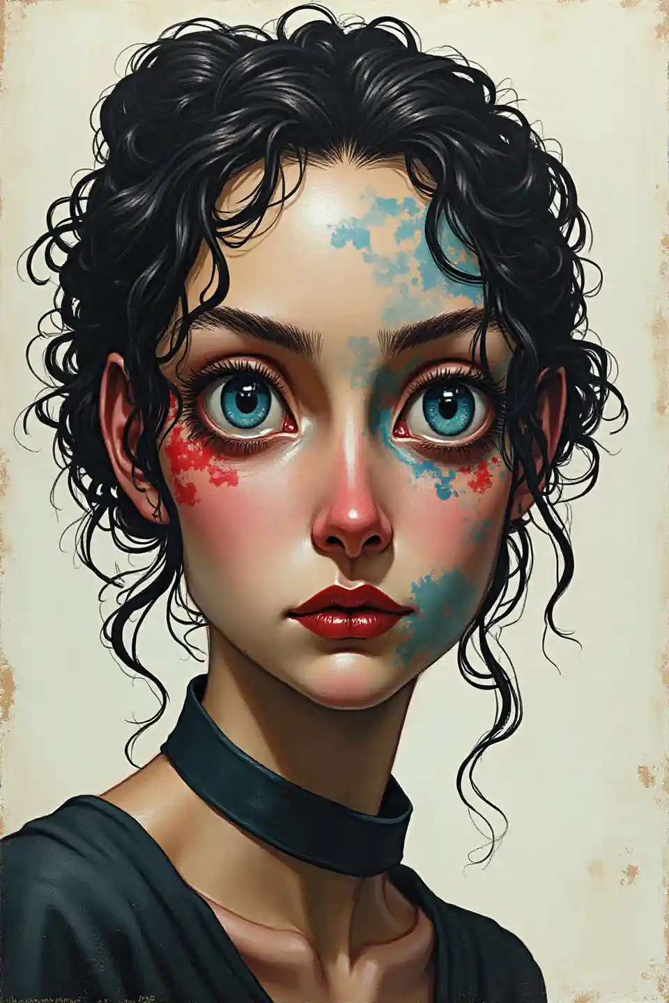 Kazi hiyo ina picha ya mwanamke iliyo na mtindo wa kuunganisha mambo halisi na mambo yasiyo halisi. Mtazamo wa uso ni mbaya na con