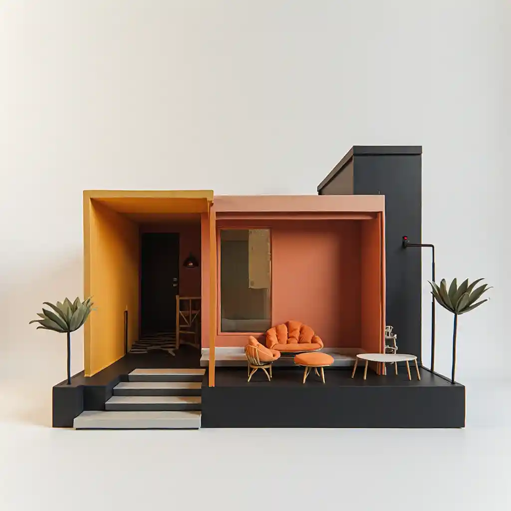 Maqueta ya rangi ya akriliki ya nyumba ndogo iliyoongozwa na kazi ya usanifu ya Luis Barragan Que la maqueta esté dentro de un capelo na background nyeusi minimalista