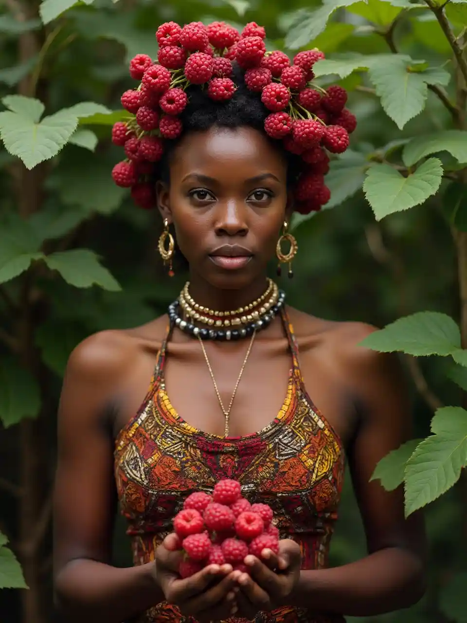ScarlettPicha ya mwanamke mrembo kutoka hadithi ya Afrika akiwa amevaa mavazi ya kitamaduni kuzunguka vipande vya raspberry