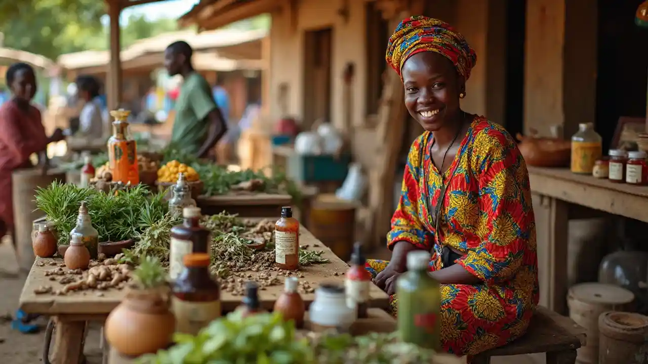 Mwuzaji wa mitishamba wa kawaida katika soko lenye shughuli nyingi la Afrika, akiwa amezungukwa na aina mbalimbali za mitishamba, mizizi, na chupa zilizojaa mchanganyiko wa mitishamba. Muuzaji, mwanamke kijana wa Nigeria mwenye kupendeza, ameketi kwenye kiti cha mbao, akiwa amevaa kifuniko cha Afrika na kitambaa. Kibanda chake ni meza ya mbao iliyofunikwa kwa mitishamba, miwa, na chupa za dawa za jadi, na maandishi yaliyochorwa kwa mkono. Nyuma yake, mandhari yenye rangi nyingi ya shughuli za soko, kutia ndani wafanyabiashara wengine, vikapu vilivyofumwa, na vibanda vya bidhaa, huongeza uhai kwenye mandhari. Hali ya hewa ni yenye kupendeza na ya kweli, na mwangaza wa jua unaangaza kwa joto na wateja wanata kwa udadisi.