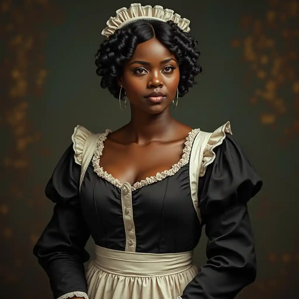 Mfanyakazi wa Victoria na ngozi nyeusi ya kuchomwa, nywele nyeusi fupi zenye kuvaa sare nyeusi na kilemba nyeupe na kofia katika karne ya 18. Uso wake ni wa asili ya Afrika. Ana sura ya chubby na ukubwa kubwa bra