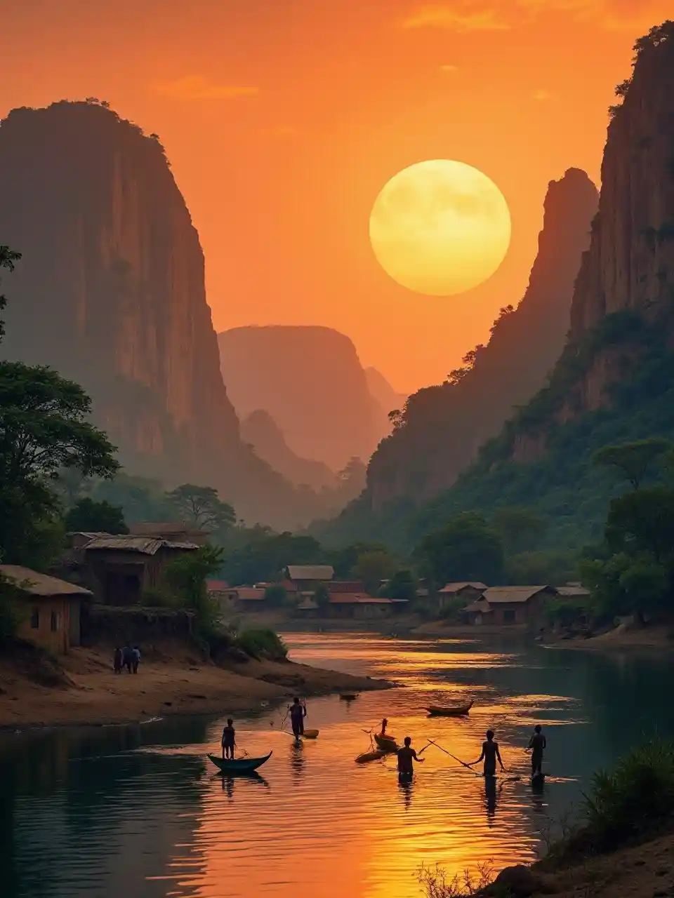 Katikati ya mandhari yenye rutuba ya Afrika, miamba mikubwa hutokea kwenye anga laini na nyekundu, na jua kubwa lenye mawimbi hufunika mandhari hiyo. Kwenye picha ya mbele kuna kijiji chenye nyumba za udongo ambazo ni rahisi na zenye aina mbalimbali, ambazo zimeenea kwa utaratibu kando ya ziwa lenye amani. Watu hujishughulisha na uvuvi wa nyavu katika kina cha chini cha ziwa hilo husababisha mawimbi ya uvivu katika maji ya giza.